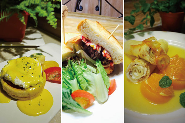 (左:班尼迪克蛋 中:手打牛肉三明治 右:澄香薄餅)