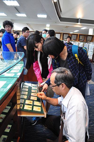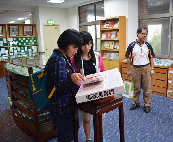黃芬蘭副管理師親自帶著大家前往圖書館三樓珍藏郵品館參觀收藏家許伯夷捐贈該校的郵票,從郵票中可認識各國不同的文化風情,自亞洲、非洲、美洲到歐洲,從清朝到民國,展出的郵票類型應有盡有,讓觀眾大為驚豔。其中,經典歌手鄧麗君女士的紀念郵票,搭配著專輯及經典名曲共同展出,最受觀眾歡迎,豐富的郵票內容美不勝收,讓師生們流連忘返。