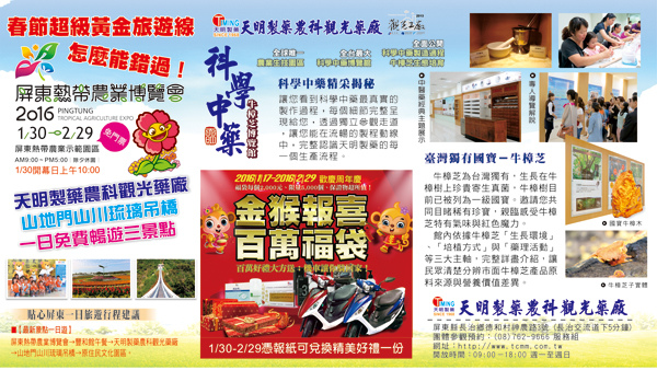 今年結合天明製藥農科觀光藥廠及山地門山川琉璃吊橋,形成一條春節超級熱門的黃金旅遊線,一日行程可參觀三個免費景點,坐落於國家級屏東農業科技園區內的天明製藥農科觀光藥廠順勢推出「金猴報喜~百萬福袋抽好禮;機車讓您騎回家」活動,最適合農曆春節全家旅遊,天明製藥農科觀光藥廠附設豐和館商城內有桂花冠時尚台菜宴會廳,由五星級飯店廚師團隊推出美味好料理,農科手工蛋捲更是必買伴手禮,過年來屏東,好吃又好玩!