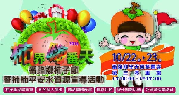 全國柿子產量最大的番路鄉,10月22、23日在嘉義縣半天岩紫雲寺第三停車場番路柿子節火熱登場,先場邀請到溫翰龍、高佳群、董育君、林喬安等歌手將帶來多首動聽歌曲,還有民和國民中學的電音三太子、街舞及民和國小的舞蹈飆演等在地優秀的團體帶來精采表演,將帶給大家耳目一新的藝文饗宴,讓民眾來到番路鄉,有得吃,有得玩。