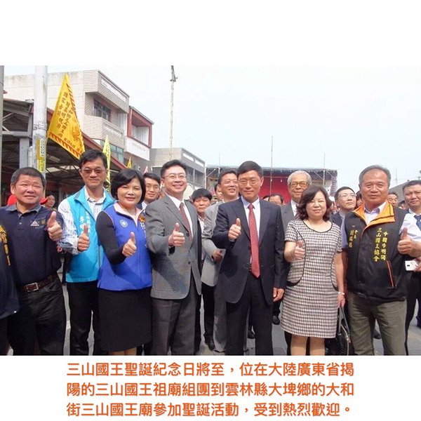 廣東省粵台經濟文化交流中心常務理事侯振富率廣東省三山國王霖田祖廟會香團40餘人,今天下午3點抵達大埤鄉三山國王廟,廟方前主委、中國巾明獨三山國王協會總會長劉瑞德,帶領陣頭熱烈歡迎,立委張麗善、縣議員李明哲、陳樹吉到場與會。