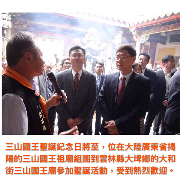 中國廣東省粵台經濟文化交流中心、廣東省三山國王霖田祖廟一行人,18日前往大埤鄉三山國王廟,針對三山國王宗教文化進行交流,希望藉由民間信仰力量,讓兩岸人民更加親密與相互了解。