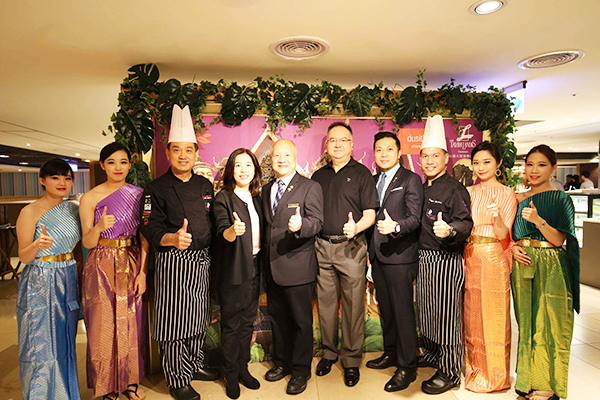 (由左至右)清邁都喜酒店行政總主廚Chalong Sakkapalangkul、大億麗緻酒店嚴心誼總經理、台南應用科技大學董事長翁廷碩、清邁都喜酒店總經理、台南應用科技大學旅館管理系主任陳冠穎、清邁都喜酒店副主廚Prapat Kaewwannee於泰國美食節開心合影