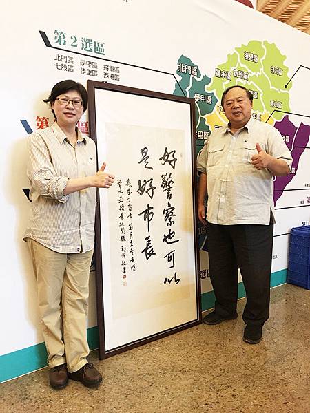 書法家林幸絹(左)致贈親手寫的「好警察也可以是好市長」墨寶 ,給台南市長參選人陳子敬,為他加油打氣。