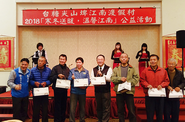 台糖尖山埤江南渡假村本著回饋社會的理念,特別選在107年2月10日農曆春節前,舉辦「寒冬送暖‧溫馨江南」公益活動,邀請渡假村周邊鄰里(旭山里、果毅里、神農里、南溪里)低收入戶、獨居老人等弱勢居民,在這歲末寒冬之際,一起來分享溫暖與關愛。
